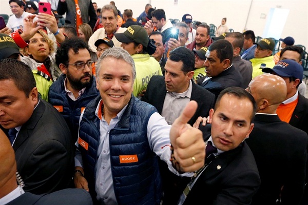 En la primera vuelta realizada el pasado 27 de marzo, Duque consiguió más de 7,5 millones de votos (39,14 %), seguido de Petro, candidato del movimiento Colombia Humana, que obtuvo 4,8 millones (25,08 %).