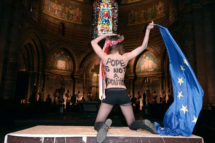 Una militante del grupo feminista Femen se subió el lunes, con el torso desnudo, al altar de la catedral de Estrasburgo, para protestar por la visita que el papa Francisco hará el martes a las instituciones europeas.