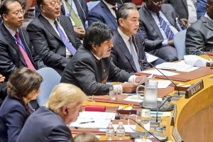 Venezuela está sufriendo una agresión descarada de parte de Estados Unidos y sus aliados. Latinoamérica rechaza de manera clara los intentos de intervenir militarmente a Venezuela”, dijo Morales ante los líderes, ministros y embajadores de 130 países del planeta.