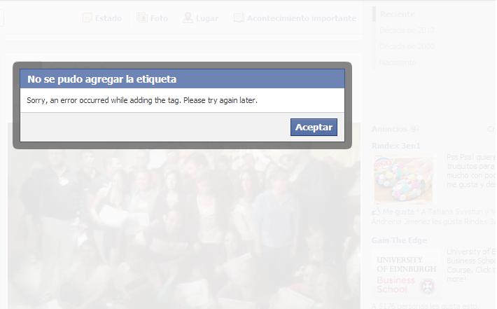 Al intentar publicar algo, Facebook muestra un mensaje de error como el incluido en el pantallazo de arriba, animando a los usuarios a probar dentro de unos minutos.