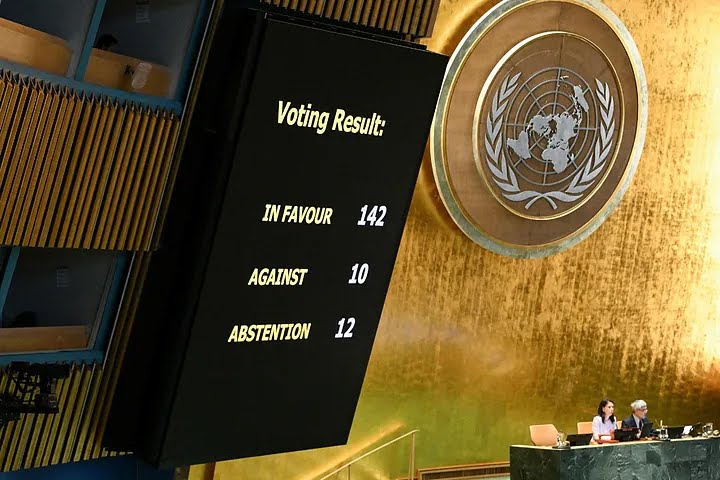 La Asamblea General de las Naciones Unidas adoptó este viernes con una abrumadora mayoría de 142 votos a favor una resolución que pide una vía pacífica para resolver la cuestión de Palestina y la aplicación de la solución de dos Estados. La resolución contó con 12 abstenciones y 10 votos en contra, entre ellos los de Estados Unidos, Israel, Argentina y Hungría.
