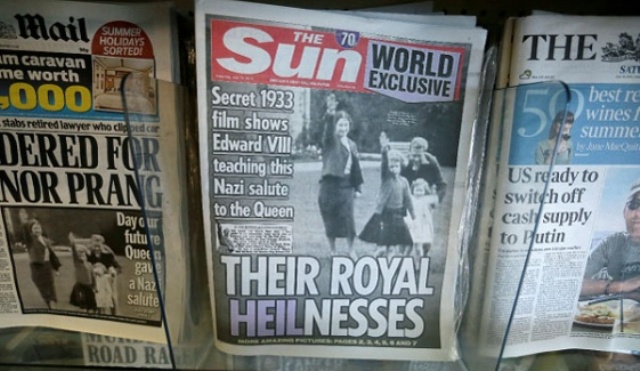 La edición del sábado del diario The Sun muestra en portada a la reina, cuando tenía unos seis años, realizando el saludo nazi junto a su madre.