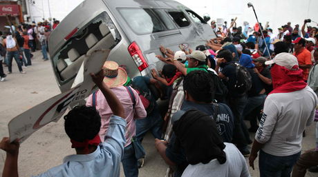 Los maestros llegaron hacia las 11.00 hora local (17.00 GMT) a las instalaciones de este partido (en el poder a nivel federal) y se metieron a la fuerza para causar destrozos y prenderles fuego.