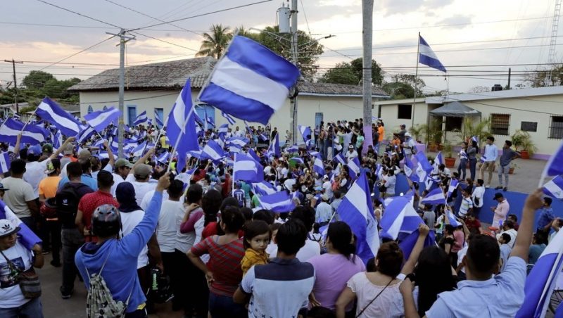 Este sábado, una manifestación pacífica recorrió Niquinohomo, al sur de la capital, pueblo natal del general Augusto Sandino (1895-1934) y escenario de una batalla campal el viernes entre opositores y sandinistas, por los colores del monumento del héroe nacional.