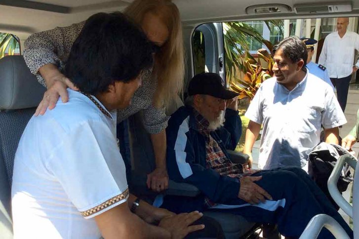 “Para Bolivia todo el cariño del mundo y mi admiración”, dijo Fidel Castro mientras Morales, que había llegado en la madrugada para celebrar el onomástico, lo abrazaba.