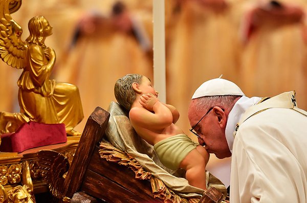 El servicio para unas 10,000 personas en la Basílica de San Pedro comenzó con un largo canto en latín, conocido como Kalenda, la tradicional proclamación del nacimiento de Jesús. Luego las campanas sonaron y el Papa, vestido de blanco, besó una estatua del Niño Jesús para dar inicio a la solemne ceremonia.