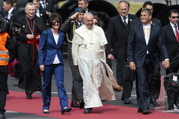 En este acto el Papa fue recibido por el presidente Rafael Correa, acompañado de representantes del gabinete ejecutivo del país andino y otros representantes, posteriormente Francisco comenzará sus actividades en Ecuador este domingo.