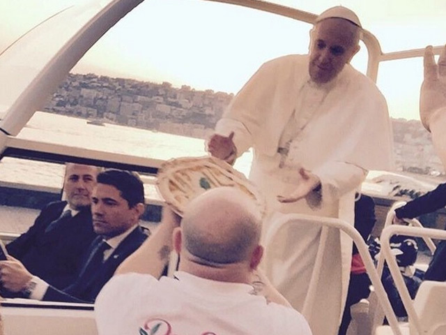 En medio de su paseo por la ciudad del sur de Italia, el maestro pizzero Enzo Cacciale se acercó al papamóvil en movimiento y le ofreció una de sus creaciones a Jorge Bergoglio, el mismo que hace pocas semanas declaró que extrañaba «comerse una pizza» en su porteña Buenos Aires.