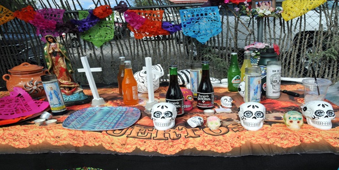 El altar fue colocado en “El Tiradito”, una histórica capilla al aire libre en el centro de la ciudad de Tucson, que fue adornada con coloridas flores de papel, dulces, el tradicional pan de muerto y bebidas.