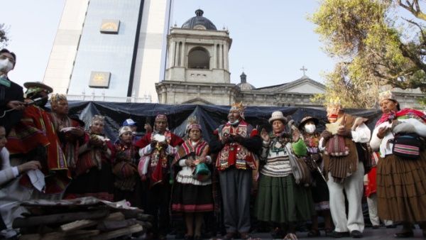 Un grupo de «amautas» o sabios espirituales indígenas aimaras prepararon un altar con ofrendas para la «Pachamama» en la plaza Murillo en La Paz, donde se encuentran el Palacio de Gobierno y la sede del Legislativo de Bolivia.
