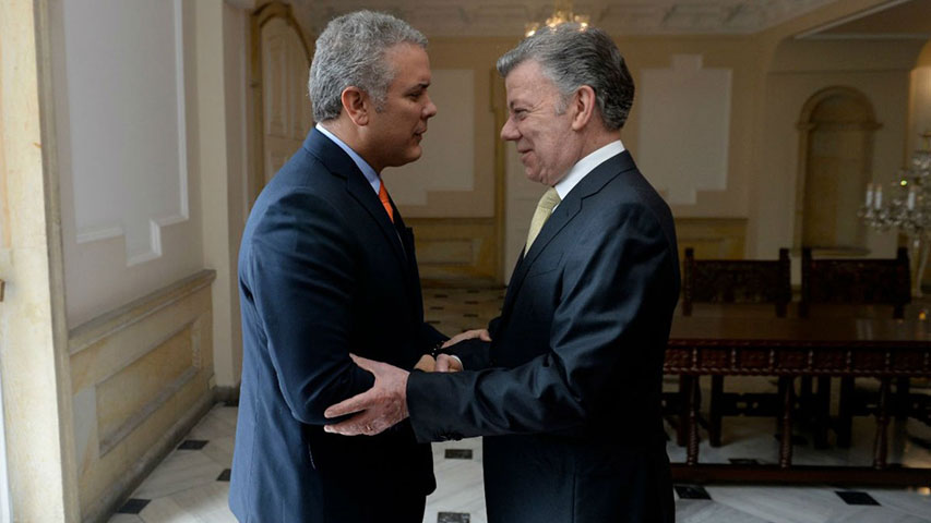 El actual presidente colombiano, Juan Manuel Santos, recibió en la Casa de Nariño a su sucesor, el presidente electo Iván Duque, para llevar a cabo la primera reunión del proceso de transición con el fin de que el mandatario electo asuma el poder el próximo 7 de agosto.