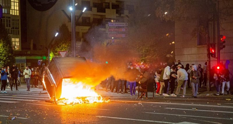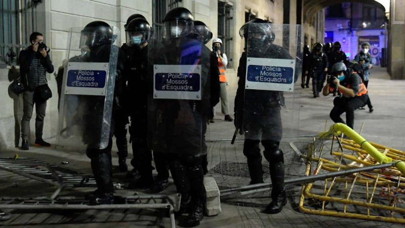 En Barcelona, decenas de manifestantes encendieron fuego a contenedores de basura y arrojaron ladrillos y fuegos artificiales a los Mossos d’Esquadra, que respondieron con porras ante la arremetida de los civiles.