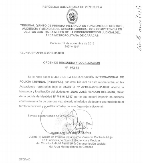 Según el comunicado publicado en la página web de la ministra de Comunicación e Información, Delcy Rodríguez, también se emitió la orden de localización y búsqueda de Rendón, a fin de que una vez ubicado, sea trasladado al territorio nacional y puesto a la orden de la Fiscalía.