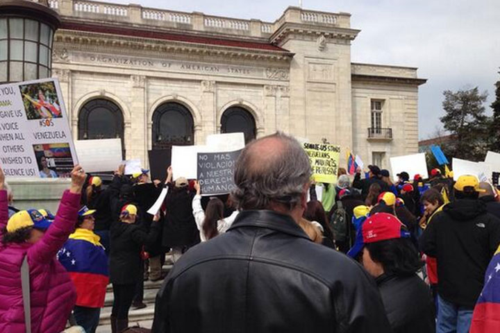 Venezolanos se congregan frente a la sede de la Organización de Estados Americanos (OEA), en Washington, EEUU, donde se realiza una sesión de caracter privado y donde se analiza la situación del país.