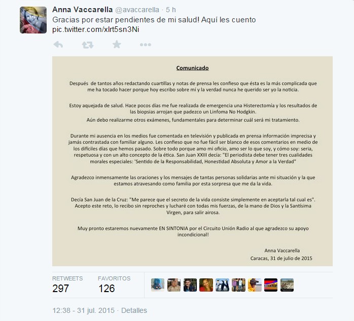 A través de su cuenta en la red social Twitter, la comunicadora ha recibido innumerables muestras de apoyo tras difundir el comunicado. «Agradezco inmensamente las oraciones y los mensajes de tantas personas solidarias ante mi situación y la que estamos atravesando como familia por esta sorpresa que me da la vida» escribió la periodista.