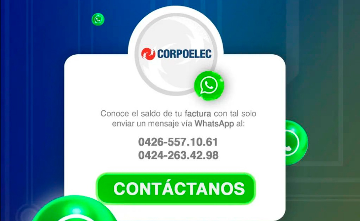 “Conoce el saldo de tu servicio eléctrico a través de los números 0426-557.1061 y 0424-263.4298 por WhatsApp, en el horario de Lunes a Viernes de 8:00am a 4:00pm, para solicitar tu estado de cuenta y factura”, escribió Corpoelec en el mensaje, reseñado además por el portal Venezuela News.