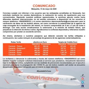 La línea aérea Conviasa anunció que realizará vuelos de repatriación a solicitud de las embajadas acreditadas en Venezuela, en medio de la pandemia del coronavirus.