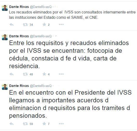“Entre los requisitos y recaudos eliminados por el IVSS se encuentran: fotocopia de cédula, constancia de fe de vida, carta de residencia. Mientras que los recaudos eliminados por el Ivss son consultados internamente entre las instituciones del Estado como el Saime y el CNE”, escribió tras encuentro con el presidente del Seguro Social (Ivss), Carlos Rotondaro.
