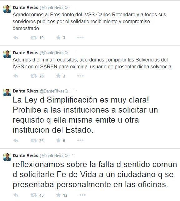 La Autoridad Única Nacional para la Simplificación de Trámites y Permisos, Dante Rivas, informó a través de su cuenta en la red social Twitter, @DanteRivasQ, sobre la eliminación de requisitos para los pensionados, a fin de agilizar los procedimientos y prestar un servicio más rápido.