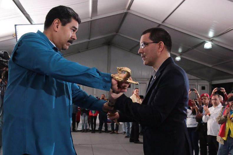 El presidente de la República, Nicolás Maduro, entregó este jueves la réplica del sable del Libertador, Simón Bolívar, al canciller Jorge Arreaza, por la defensa de Venezuela en la Organización de Estados Americanos (OEA).
