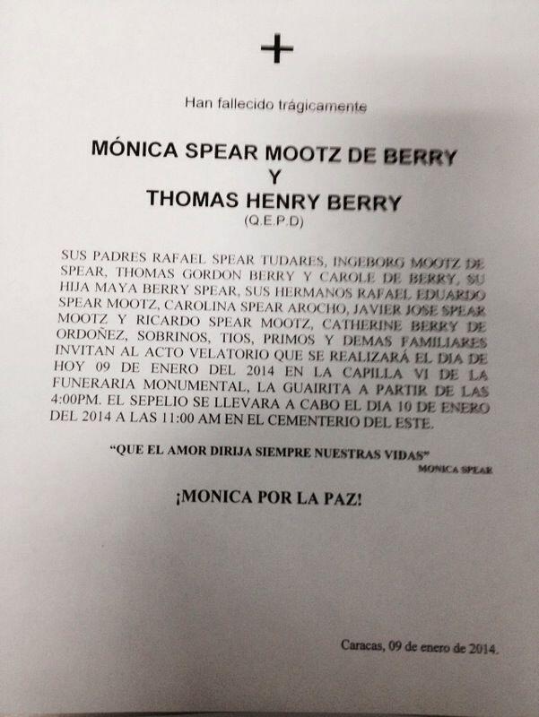 Así invitaron los familiares a sus amigos y allegados al funeral de la ex reina de belleza, Mónica Spear, asesinada el pasado lunes.