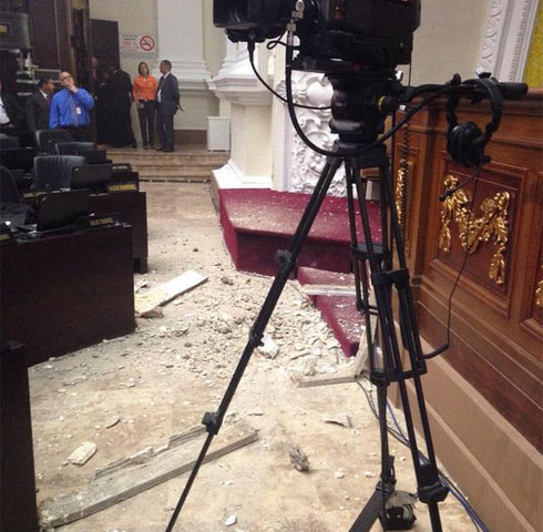 “Se derrumba el techo en la Asamblea Nacional mientras esperábamos el inicio de la sesión”, informó Gómez Sigala a través de su cuenta en twitter @egomezsigala.