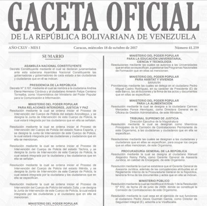 En gaceta oficial N° 41259 se ordena la intervención de los cuerpos policiales de los cincos estados en los cuales ganó la Mesa de la Unidad Democrática (MUD) en los pasados comicios regionales.