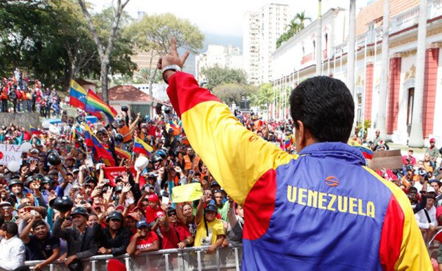 El presidente Nicolás Maduro recibe a simpatizantes del chavismo en las afueras del Palacio de Miraflores para celebrar el primer año de su triunfo en las pasadas elecciones del 14 de abril.