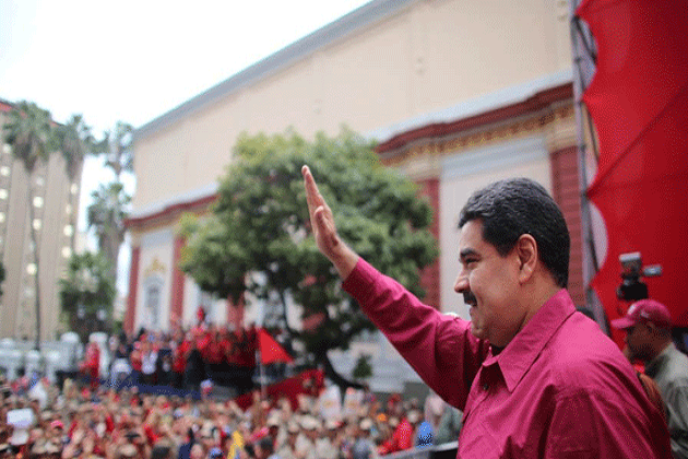 El presidente de la República, Nicolás Maduro, como se esperaba, llegó a las 3 de la tarde al Palacio de Miraflores acompañado de la primera combatiente, Cilia Flores, saludando desde la tarima a sus simpatizantes. Posteriormente, al iniciar el acto se escuchó el Himno Nacional, para luego pronunciar su discurso.