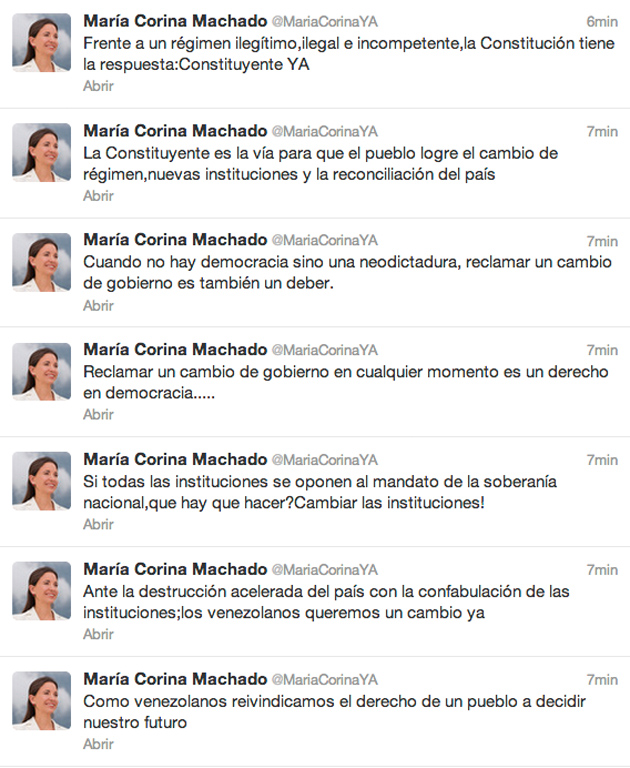 Machado lanzó tuits desde temprano y manifestó que el cambio en Venezuela podría llegar rápidamente si se activa el mecanismo constitucional.