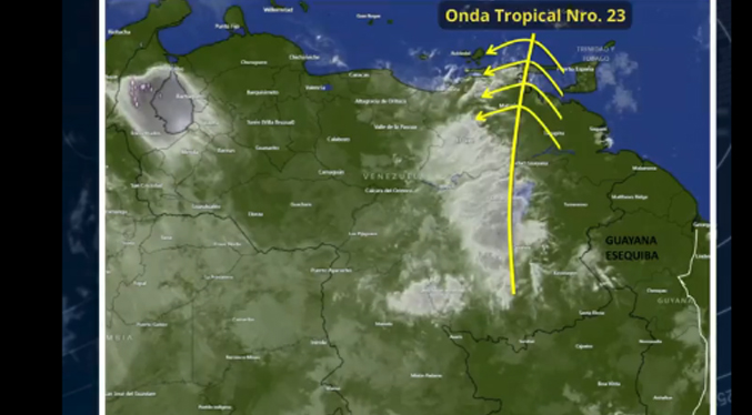 «La Onda Tropical Nro. 23, ubicada al momento en el oriente Venezolano; asimismo; se aprecian mantos nubosos, generadores de lluvias o chubascos algunos con actividad eléctrica en áreas de Bolívar, Amazonas, Sucre, Monagas, Anzoátegui, Trujillo, Mérida y Zulia; el resto del país se aprecia con cielo parcialmente nublado», informó elInameh.