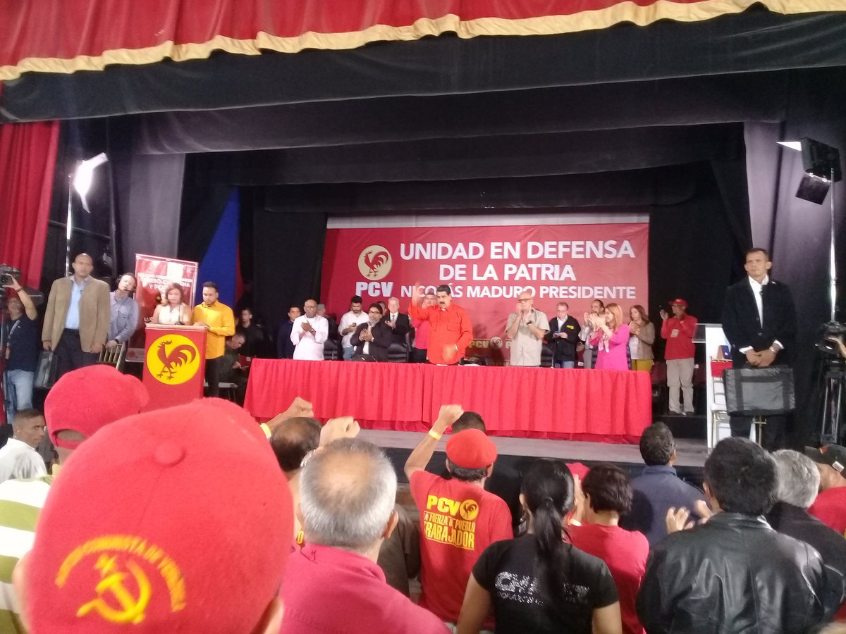 l Partido Comunista de Venezuela, PCV, oficializó este lunes por la noche su respaldo a Nicolás Maduro en su intención a la reelección presidencial. El acto se realizó en el Teatro Canta Claro de la capital venezolana y fue parte de la clausura de la XIV Conferencia Nacional.