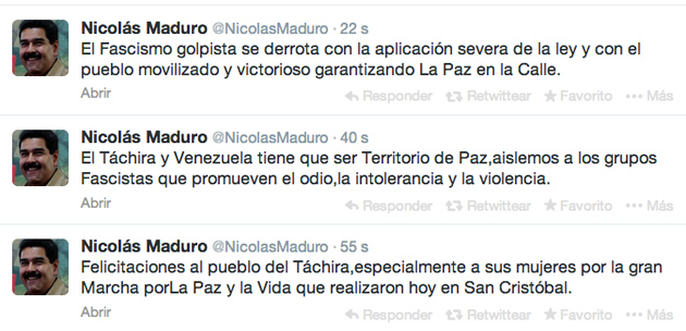 “Felicitaciones al pueblo del Táchira, especialmente a sus mujeres por la gran marcha por la paz y la vida que realizaron hoy en San Cristóbal”, señaló.