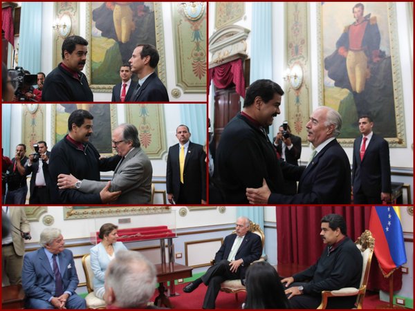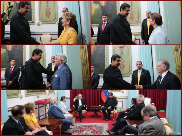 Este sábado, el Presidente Maduro mantuvo una conversación con los ex presidentes Laura Chinchilla y Miguel Ángel Rodríguez (Costa Rica); Andrés Pastrana (Colombia); Jorge Quiroga (Bolivia); Mireya Moscoso (Panamá); y Luis Alberto Lacalle (Uruguay), quienes se encuentran en el país por invitación de la autollamada Mesa de la Unidad Democrática (MUD), coalición de la derecha venezolana.