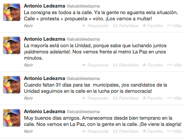 El Alcalde Metropolitano y candidato a la reelección por la MUD, Antonio Ledezma, aseguró que la “consigna es todos a la calle”, de cara a las elecciones municipales del 8-D.