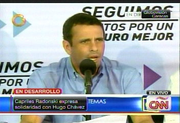 El gobernador del estado Miranda, Henrique Capriles, expresó su solidaridad con el mandatario nacional Hugo Chávez.“Siempre se lo dije al Presidente, una cosa es la lucha por la política y otra por la vida”, manifestó esta tarde en rueda de prensa.