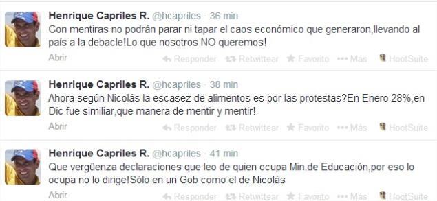 Este martes el líder opositor Henrique Capriles Radonski negó, a través de su cuenta en Twitter, que la escasez de alimentos que azota al país esté vinculada con las protestas que han tenido lugar las dos últimas semanas.