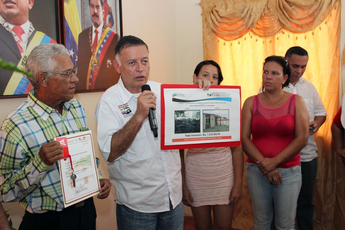 37 viviendas tipo Suvi, unifamiliares ejecutadas por parte del Instituto de Vivienda y Hábitat del Estado Zulia (INZUVI). El Gobernador Bolivariano del Estado Zulia Francisco Arias Cárdenas reiteró que el Zulia hay ejecutadas 71 mil 981 y 866 viviendas entregadas en 4 estados del territorio nacional, el Estado Zulia entrega 415 viviendas. «La Gran Misión Vivienda Venezuela no para, esto lo decimos constantemente y lo decimos con hechos con obras. La Gran Misión vivienda Venezuela que ahora esta relanzándose hacia el fin del año”.