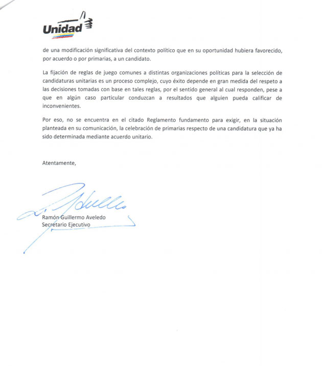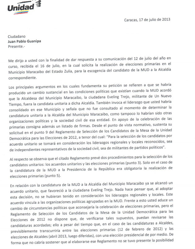 En el documento presentado por la MUD se explican las razones del dirigente; sin embargo, el bloque democrático nacional sostiene que las condiciones no han cambiado y que, por tanto, Eveling Trejo sigue siendo la abanderada.