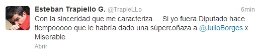 Esteban Trapiello, productor y polémico tuitero pro oficialista, lanzó un mensaje que retumbó en medio de la polarización extrema. «Con la sinceridad que me caracteriza…. Si yo fuera Diputado hace tiempooooo que le habría dado una súpercoñaza a @JulioBorges x Miserable».