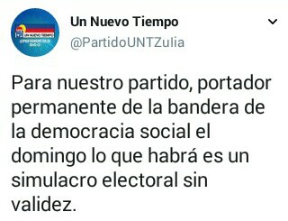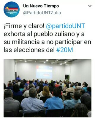 El partido Un Nuevo Tiempo (UNT), a tres días de los comicios reafirmo que “mantiene su posición firme y definitiva de no participar en las elecciones presidenciales pautadas para este domingo 20 de mayo”.