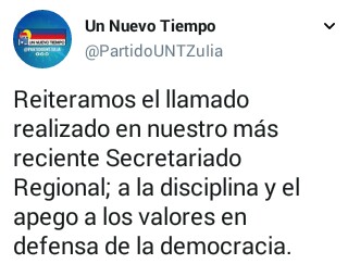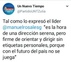 A través de sus cuentas en redes sociales el partido político nacido en la tierra del sol amada y liderado por el ex gobernador Manuel Rosales Guerrero exhortó este jueves a toda su militancia política y pueblo zuliano en general a no participar en las elecciones del 20 de mayo