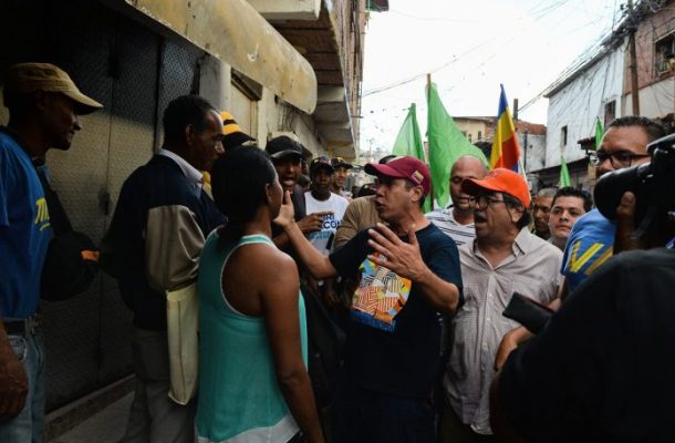 “¡Queremos pollo, arroz, plátano!”, grita una mujer desde un balcón en la barriada de Petare. Se lo dice a Henri Falcón, el solitario opositor que busca destronar al presidente Nicolás Maduro, a quien llama “el candidato del hambre”.