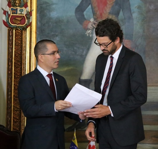 Este miércoles, el canciller de la República, Jorge Arreaza, entregó una nota de protesta al encargado de negocios de Canadá en el país, Craib Kowalik, tras las declaraciones ofrecidas por el gobierno de la nación norteamericana cuestionando los resultados de las recientes elecciones regionales celebradas en el país.