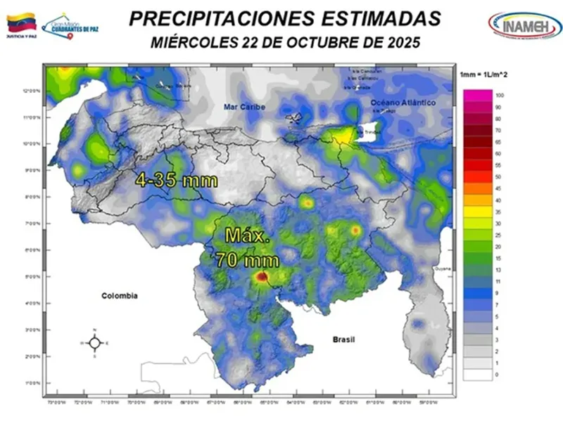 El Instituto Nacional de Meteorología e Hidrología (Inameh) pronostica para este miércoles 22 de octubre de 2025 un clima de transición en Venezuela, con predominio de nubosidad fragmentada y zonas despejadas en gran parte del territorio, pero con una intensificación de las precipitaciones en horas de la tarde y noche.