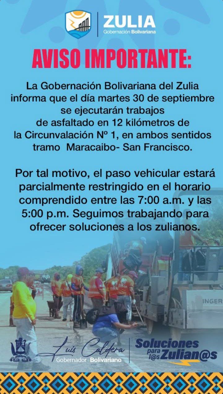 La Gobernación del Zulia anunció la restricción parcial del paso vehicular por la Circunvalación 1, entre Maracaibo y San Francisco, entre las 7:00 AM y 5:00 PM, debido a trabajos de asfaltado de 12 kilómetros, como parte de un plan de rehabilitación vial. Las autoridades piden a los conductores tomar previsiones, usar vías alternas y mantenerse informados a través de los canales oficiales.