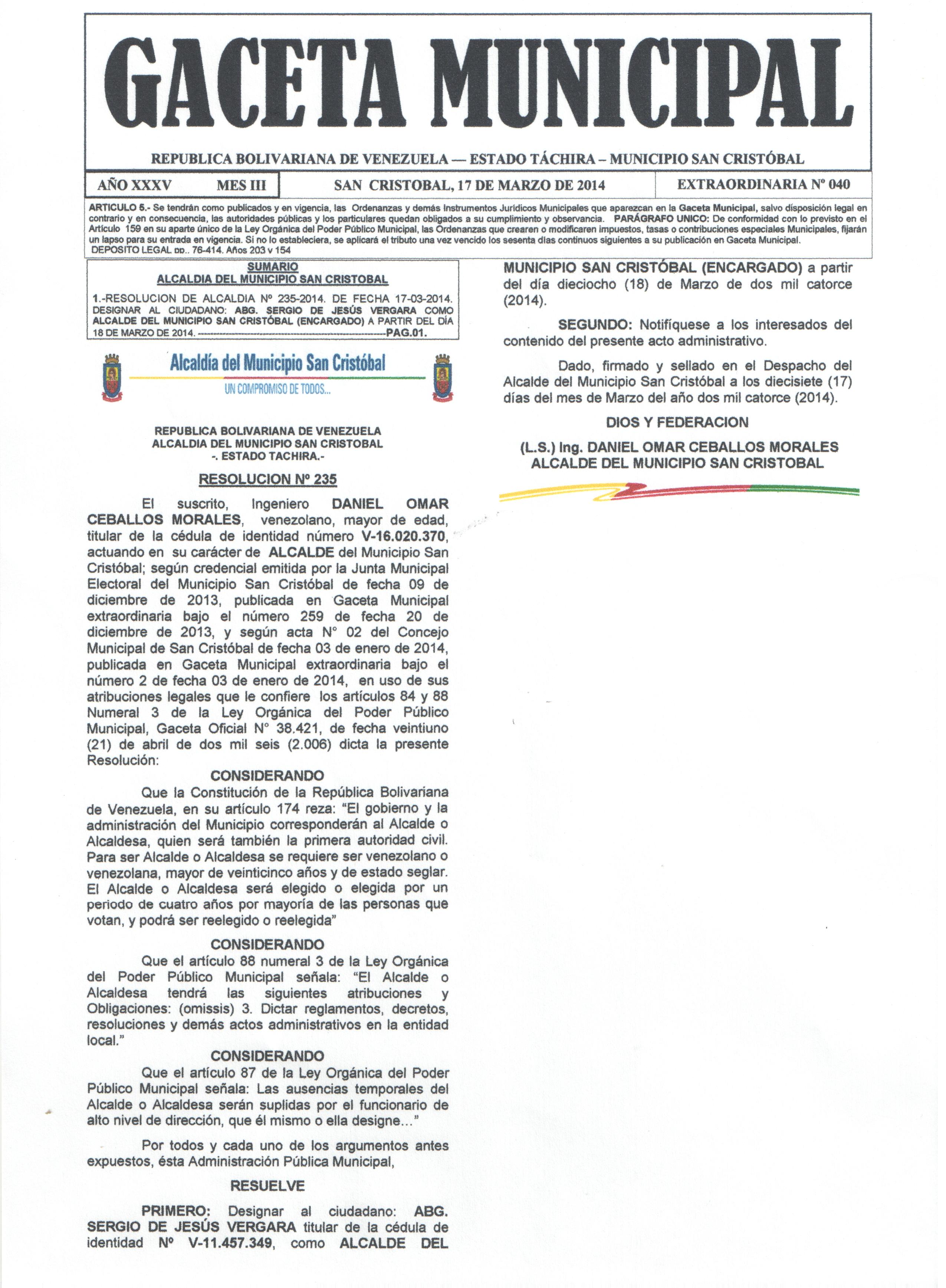 Precisa el documento municipal, en resolución N° 235-2014 de fecha 17-03-2014, que Ceballos Morales designa al abogado Sergio de Jesús Vergara como alcalde encargado desde el 18 de marzo de 2014.