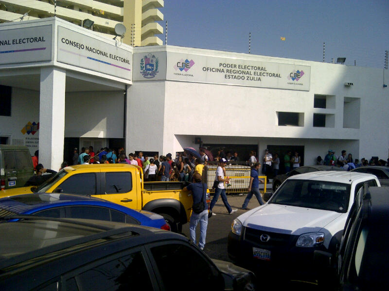 A las 5.00 de la tarde de este lunes permanecen las colas de personas en la oficina zuliana del Consejo Nacional Electoral, en la avenida El Milagro, la mayoría para inscribirse por primera vez en el Registro Electoral. La multitud se extiende hasta el Hotel Intercontinental.
