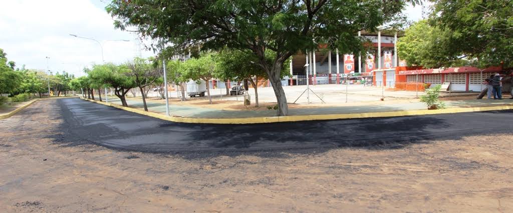 El Ejecutivo Regional continuó este viernes con las labores de recuperación de las instalaciones deportivas con el asfaltado del estacionamiento donde se vertieron 400 toneladas de asfalto con una inversión de 8 millones de Bolívares y demarcación de esta área que se estima este culminada para la semana entrante.