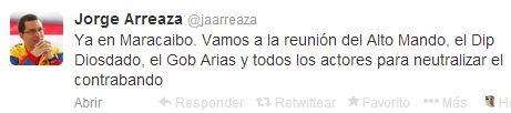 «Ya en Maracaibo. Vamos a la reunión del Alto Mando, el Diputado Diosdado (Cabello), el Gobernador Arias y todos los actores para neutralizar el contrabando», escribió en @jaarreaza.